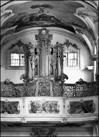 Orgel mit zwölf Registern auf einem Manual und Pedal.