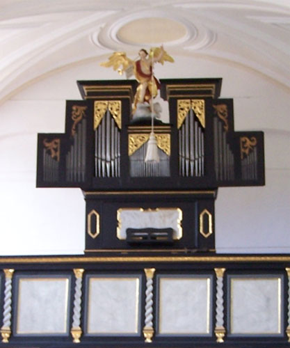 Orgel mit zehn Registern auf einem Manual und Pedal.